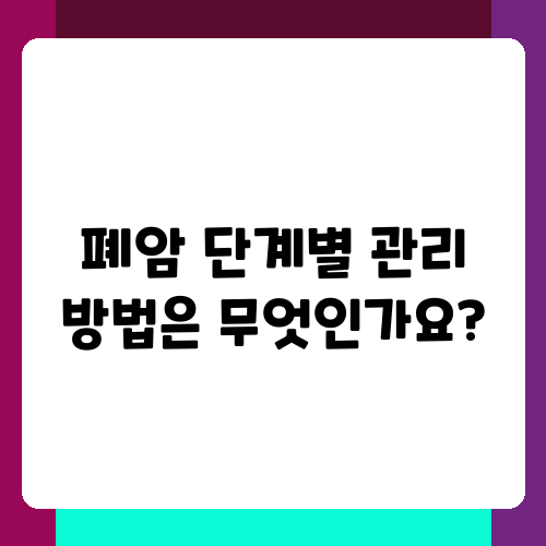 폐암은 단계별로 치료 및 관리 방법이 달라집니다. 초기 단계에서는 수술을 통해 암을 제거하고, 정기적인 검진을 통해 재발 여부를 확인합니다. 진행된 단계에서는 항암 치료, 방사선 치료 등을 병행하며 환자의 상태에 맞는 적절한 관리가 중요합니다. 항암 치료 부작용 관리도 중요한 부분입니다. 구토, 메스꺼움, 탈모 등의 부작용을 최소화하기 위해 의사의 지시를 잘 따르고, 영양 관리에도 신경 써야 합니다. 정기적인 검진과 의료진과의 꾸준한 소통을 통해 환자의 상태를 정확하게 파악하고 적절한 대처를 하는 것이 중요합니다. 환자의 심리적 안정을 위한 지원도 꼭 필요하다는 점을 잊지 마세요.